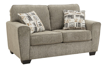 For seating that feels as good as it looks, the choice is clear. This loveseat has a neutral mocha hue that blends effortlessly with any room decor and color scheme. Its soft textured chenille fabric with chevron effect beckons you to sit and relax. Wide track arms elevate the look with a touch of contemporary sensibility, enticing you to settle in and stay awhile. Caramel and black toss pillows are a designer favorite.